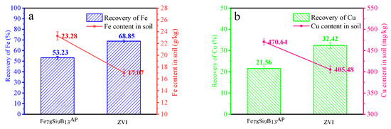 The recovery of Fe (a) and Cu (b) from soil by magnetic separation after Fe78Si9B13AP and ZVI treatment (initial Cu in soil = 600 mg/kg, soil/solution = 1 g/10 mL, stabilizers dosage = 50 g/kg, T = 323 K).
