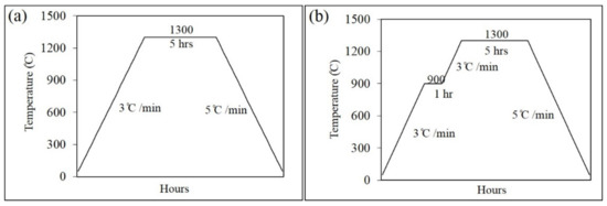 The sintering process was performed in a vacuum furnace at 1300 °C using a heating rate of 3 °C/min. In this work, two sets of sintering parameters were prepared, as shown in Figure 1. The sintered parts prepared at a sintering temperature of 1300 °C (Figure 1a) were denoted as Ti-HA(1). On the other hand, the sintered parts presintered at 900 °C prior to sintering (Figure 1b) were denoted as Ti-HA(2).