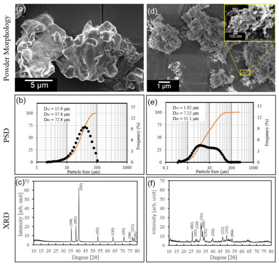Figure 2. Powder morphology of raw powder (a) Ti6Al4V, (d) HA, particle size distribution of raw powder (b) Ti6Al4V, (e) HA, and X-ray diffraction pattern of raw powder (c) Ti6Al4V, (f) HA.