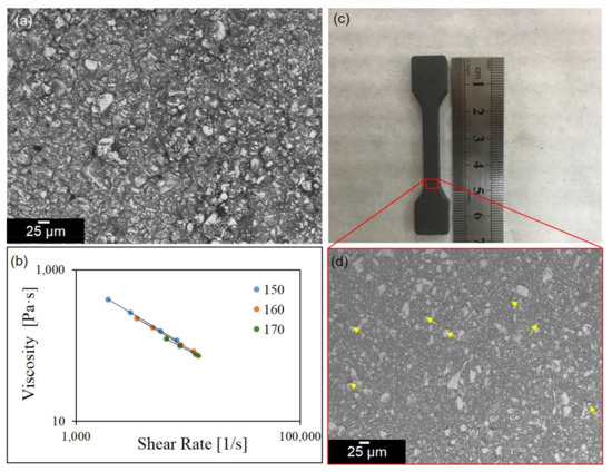 Figure 3. (a) SEM image of the feedstock, (b) flow behaviour of the feedstock, (c) green part and (d) SEM image of the green part.
