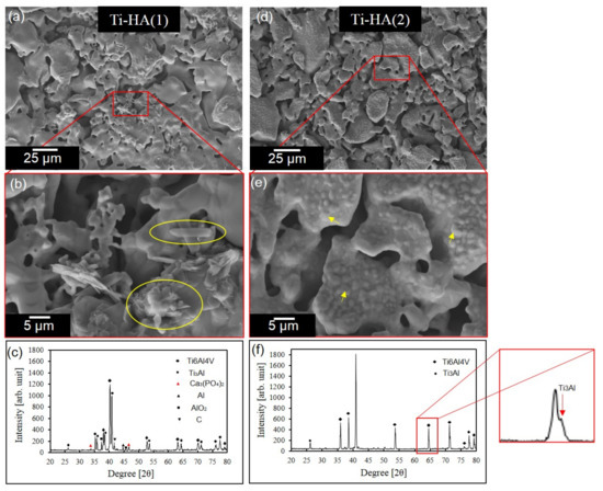 Figure 4b shows an enlargement image of Ti-HA(1), where a needle-like structure is observed (marked with a yellow area), indicating that the transformation of other phases has occurred. Figure 4e is an enlargement image of Ti-HA(2), where a tiny particle (marked with a yellow arrow) was observed in the outer layer of Ti6Al4V powder particles and was dispersed in a homogenized way. This kind of homogenizedly coated structure of HA in the Ti6Al4V particle is beneficial for the osseointegration process, as the addition of HA improves the biocompatibility and promotes the interaction of the composites with bone cells.