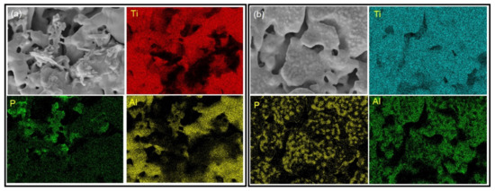 The XRD analysis was validated by the EDS mapping, conducted as shown in Figure 5. It is observed that the Ti phases and Al phases did not thoroughly overlap, thus validating that the Ti6Al4V powder partially transformed into α2 phases for both sintered parts, with the intensity of the α2 phases in Ti-HA(1) being higher than for Ti-HA(2).