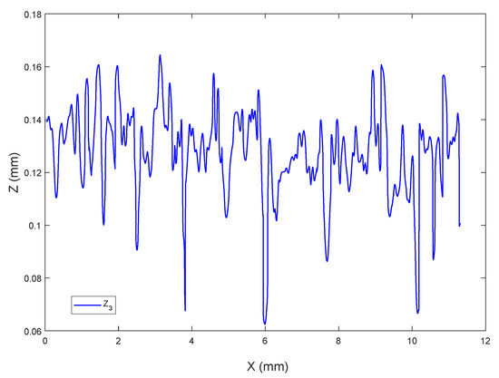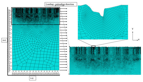 The FE model was built using the two-dimensional real surface contour of the specimen measured by profilometry to capture the complexity of the surface roughness as depicted in Figure 3. The final dimensions of the model are considered to be . The size of the FE model was determined based on the length of the measured profile, thickness (15 mm), and the width of the studied sample, in such a way to be large enough as a representative model for the real engineering situation.
