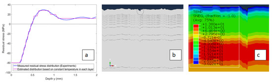 The residual stress effect is considered by proposing layer-wise global modeling with a constant temperature in each layer following the measured residual distribution obtained in the experiments. In Figure 4a, the measurement-based residual stress distribution is shown as a solid smooth line, while the stepwise continuous lines demonstrate the discontinuous residual stress distribution employed in the layer-wise FE model. Figure 4b shows the applicability of the proposed modeling approach in defining layers with constant temperatures using the estimated through-thickness residual stress distribution.