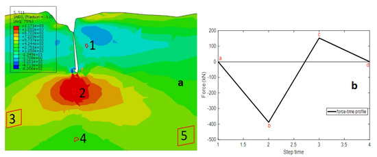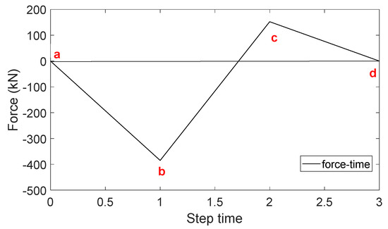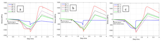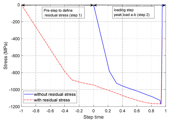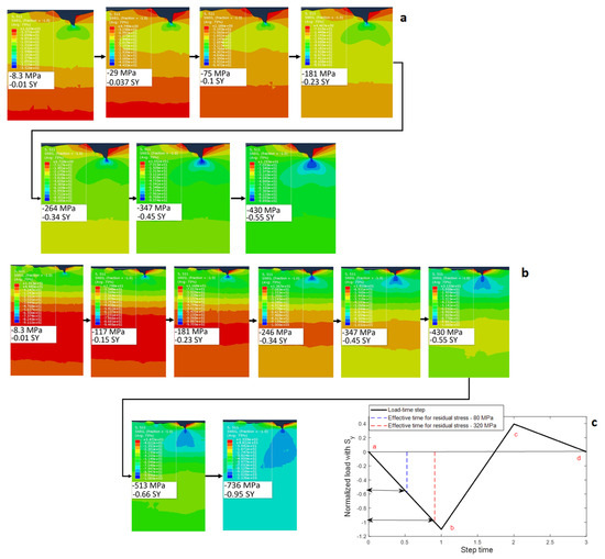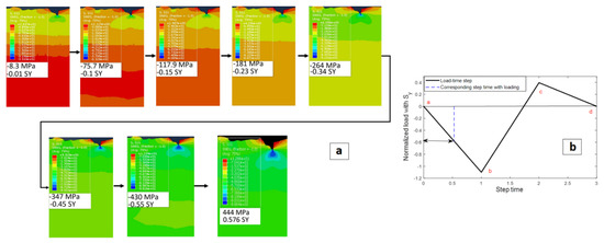 This phenomenon might be related to the relaxation of residual stress occurring under this loading condition. The initial residual stress field inherent to or produced during the manufacturing process may change and may not be constant during the operation life of the finished component under residual stress. These residual stresses may be reduced and redistributed, and this diminution is referred to as relaxation. If the sum of the applied and residual stresses locally exceeds the yield stress of a material, residual stress relaxation occurs. Thus, residual stresses do not remain constant, but are relaxed or altered and redistributed during service. Generally, a large relaxation would be expected in the high-stress region, similar to what occurred in this study with an external load value of . Figure 10a depicts the stress distribution at different time steps of the loading. It can be seen that the multi-layer residual stress distribution disappears at step of the loading, or around the middle of the loading step from point a to point b, as depicted in Figure 10b.