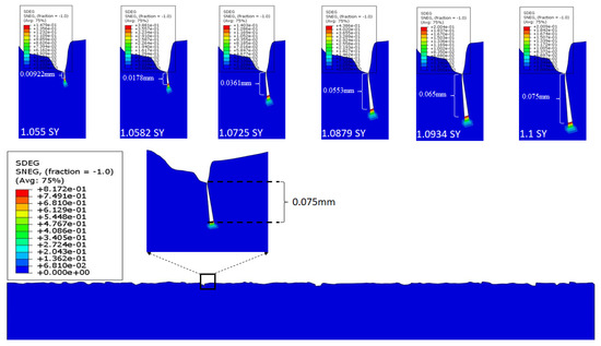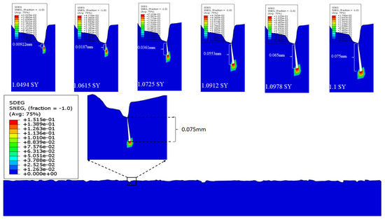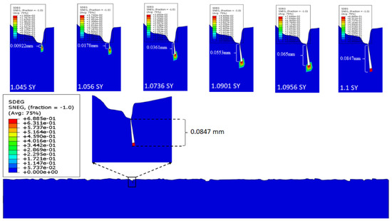 Figure 6 shows the damage initiation, evolution, and crack formation based on element deletion for the most critical micro-notch caused by the surface roughness using ductile fracture criteria without the residual stress effect. In Figure 7, the residual stress of MPa is also considered in the FEM, using layer-wise global modeling. The result in terms of damage, i.e., formed crack size, is very similar to the analysis cases performed both with and without residual stresses.