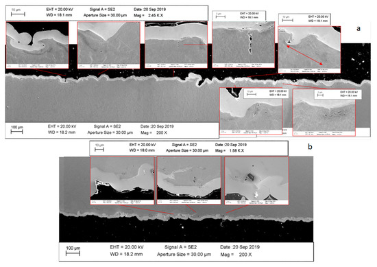 After the peak load, the sample is nickel plated, with the nickel layer having a thickness of 20–30 µm, to preserve the surface geometry. Then, sample preparation and polishing are carried out, and the top and the bottom side of the specimen are studied using scanning electron microscopy (SEM). The experimental observations from SEM images after peak load demonstrate the maximum damage size and micro-crack length to be an average of 75 µm; Figure 8a,b. The longest micro-crack on the top surface of the sample is shown with the arrow.