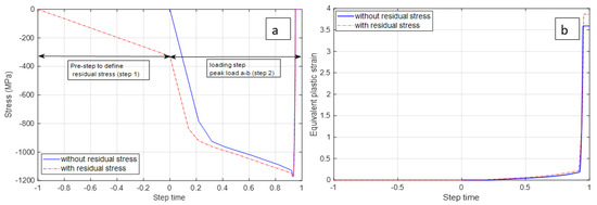 The obtained results, as presented in Figure 6 and Figure 7, raise an important question and demonstrate that further understanding and analysis are required in order to determine the effect of residual stress on damage mechanisms. For this purpose, the first element precisely below the critical notch was observed during damage with and without the residual stress effect. Figure 9a shows the stress values versus time step for this element with and without the residual stress effect. The loading time step is considered for the compression peak load from point a to point b, as depicted in Figure 5. In the case in which the residual stress effect is considered, there is a pre-step that we use to define the residual stress. In this figure, the time step from −1 to 0 represents this pre-step. As shown in this figure, the presence of residual stress as defined based on the temperature field in the pre-step causes the element to experience a stress value of MPa at the beginning of the loading step, while in the other case, without the residual stress effect, the stress values in the element start from zero at the beginning of the loading step. It can be seen, at a time step of around 0.3, that the element in both the cases with and without residual stress experiences the same stress values. Figure 9b shows the equivalent plastic strain versus time step for the first element precisely below the critical notch with and without the residual stress effect. If the equivalent plastic strains, which define the failure and removal of the element, are also similar, then we cannot expect differences in the damage initiation and crack formation for these two cases.