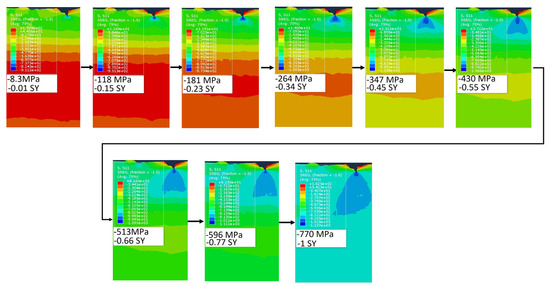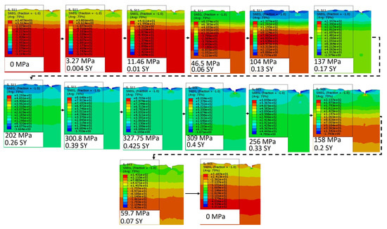 The stress distribution at different time steps of loading for the case of a residual stress of MPa is shown in Figure 13. It can be observed that the global multi-layer residual stress distribution remains effective at step 9 of loading, corresponding to of loading; however, it relaxes after some further time steps, corresponding to of loading. It can be concluded that the residual stress relaxation rate, in this case, is lower in comparison with the other case with a lower residual stress value ( MPa), while the elements do not undergo plastic deformation in the pre-step with the residual stress effect at the beginning of the loading step. These results also clarify the reason for further crack formation in the case with a higher residual stress value, compared to the case with a lower value.