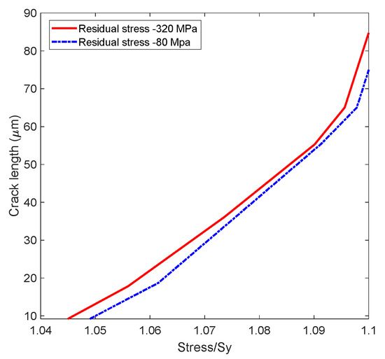 Crack length versus normalized stress with the nominal yield strength of the material with different values of residual stress ( MPa and −320 MPa).