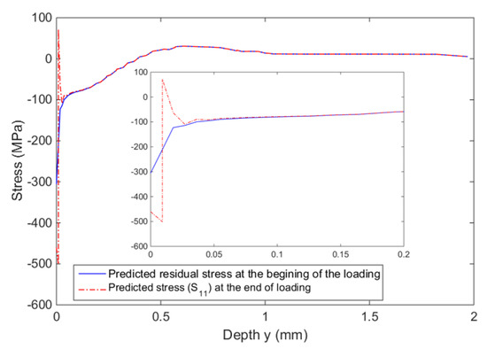 The predicted residual stress distribution at the beginning of the loading and the stress distribution at the end of loading without peak load and with the effect of residual.