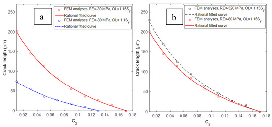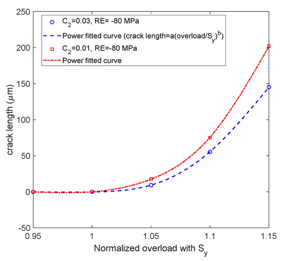 To further study the effect of the overload, five different magnitudes of peak stress, ranging from to , were considered, and the crack sizes for C2 = 0.01 and with a residual stress of MPa are presented in Figure 19. It can be seen that there is no damage for overload values lower than , and then, the crack sizes increase exponentially with increasing overload values.