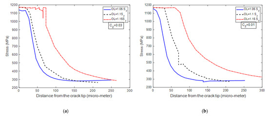 Stress distribution along the path below the tip of the crack for (a) and (b) C2 = 0.01, with a residual stress of −80 MPa.
