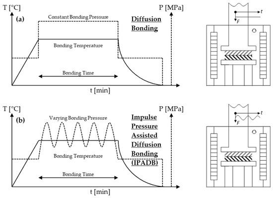 Instead of varying temperature and pressure “only” two times over the process, rapid changes of more than two times can be performed. Sheng et al. [21] rapidly cycled the temperature during diffusion bonding of Ti (TA17) and 304 stainless steel. Besides rapid temperature changes that will have little effect on larger parts in a vacuum furnace with induction heating, rapid pressure variations are another promising process to reduce processing times in diffusion bonding. Rapidly varying the applied load during diffusion bonding is a process referred to as impulse pressure-assisted diffusion bonding (IPADB) or impulse pressuring diffusion bonding (IPDB). In this work, we refer to it as IPADB since it does not have to be performed over the whole bonding time and the description that it “assists” the ongoing diffusion process by more efficiently breaking the protective oxide layer seems most accurate. Figure 2 schematically shows the difference between traditional diffusion bonding with constant bonding pressure (Figure 2a) and IPADB with varying bonding pressure (Figure 2b).