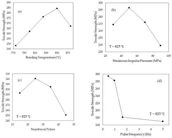 Figure 3. Optimization of IPADB parameters: (a) bonding temperature, (b) maximum impulse pressure, (c) number of pulses and (d) pulse frequency for bonding of Ti (TA17) and 304 stainless steel after Yuan et al. [26].