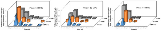 Figure 4. Influence of maximum pressure (Pmax = 20, 30, and 40 MPa) and number of pulses (0, 6, and 18) on the number and size of voids along the bonding interface of ferritic stainless steel samples produced by IPADB after data from Sharma and Dwivedi [37].