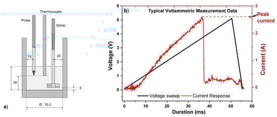 Experimental setup and data: (a) experimental setup for the dissolution test, dimensions are in millimetres; (b) typical voltammetric measurement data from the dissolution tests.