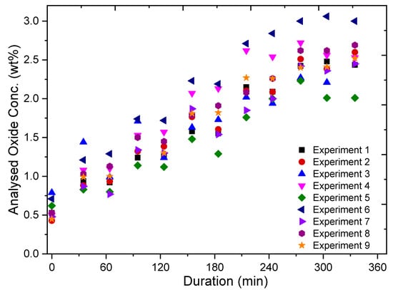 Analysed oxide concentration of electrolyte measured with the LECO apparatus for the electrolyte sampled at 30 min intervals for all the 9 experiments.
