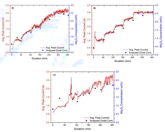 Data from the dissolution of Nd2O3 in two different equimolar NdF3–LiF electrolytes and one 20/80 mol% NdF3–LiF electrolyte, experiments 1, 2, and 3, respectively, are represented by Figure 3. All the plots in Figure 3, as well as those in the sections below, show the average peak current as a dark red line with values on the left y-axis, whereas the analysed oxide concentrations of the electrolyte samples taken every 30 min using the LECO apparatus appear as blue filled triangles with values on the right y-axis. The gradual increase in the peak current as the oxide concentration, analysed using the LECO apparatus, increases can be observed. Measurements by LECO gave maximum oxide concentrations of ca. 2.5, 2.6, and 2.3 wt% for experiments 1, 2 and 3, respectively.