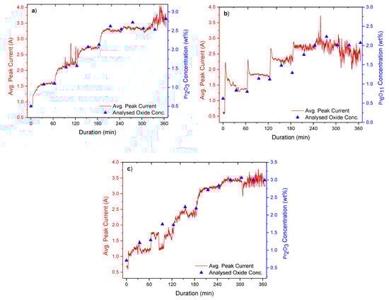 Data from the dissolution of praseodymium oxides (Pr2O3 and Pr6O11) in equimolar NdF3–LiF and PrF3–LiF electrolytes: (a,b) data from the dissolution of Pr2O3 and Pr6O11 in equimolar NdF3–LiF electrolytes as in experiments 4 and 5, respectively; (c) data from the dissolution of Pr2O3 in an equimolar PrF3–LiF electrolyte as in experiment 6.