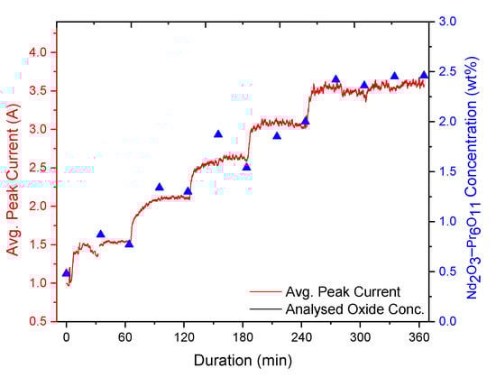 Dissolving a mixture of neodymium and praseodymium oxides (77.5 wt% Nd2O3–22.5 wt% Pr6O11) in an equimolar NdF3–LiF electrolyte, as was done in experiment 7, resulted in a maximum oxide concentration of ca. 2.5 wt% as displayed in Figure 5. The peak current increased proportionally with the oxide concentration.
