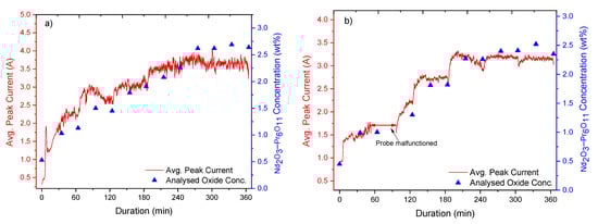 Figure 6 presents data from experiments 8 and 9, where a mixture of neodymium and praseodymium oxides (77.5 wt% Nd2O3–22.5 wt% Pr6O11) was dissolved in an electrolyte comprising NdF3, PrF3, and LiF. An increase in the peak current was observed to correspond with an increase in the oxide concentration. The maximum oxide concentrations were measured by LECO to be 2.7 and 2.5 wt% for experiments 8 and 9, respectively. Furthermore, the graphite probe malfunctioned during experiment 9 and had to be replaced. Despite this technical issue, a good fit between the measured and analysed oxide concentrations was observed.