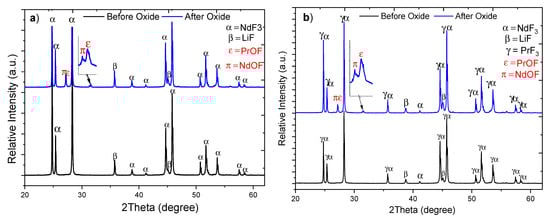 X-ray diffractograms: (a) phases present in the solidified electrolyte from dissolving Pr2O3 in an equimolar NdF3–LiF electrolyte (experiment 4) showing PrOF and NdOF; (b) phases present in the solidified electrolyte from dissolving neodymium and praseodymium oxides (77.5 wt% Nd2O3–22.5 wt% Pr6O11) in a 37.5 mol% NdF3–12.5 mol% PrF3–50 mol% LiF electrolyte (experiment 8) showing PrOF and NdOF.