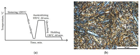 Procedures of processing powder metallurgy Fe-0.85Mo-0.65Si-1.4C steel are described in detail in Refs. [14,15,16]. Mix of powders Hogänas Astaloy 85Mo, graphite, and silicon carbide were compacted at 600 Mpa. Liquid phase sintering was carried out at 1295 °C to produce cylindrical specimens of h ~ 11 mm and diameter d ~ 18 mm and density above 7.4 g/cm3. Heat treatment comprised austenitizing at 970 °C and quenching by a stream of hot air at ~130 °C. The heat treatment diagram and microstructure of martensite and retained austenite after quenching are presented in Figure 1.