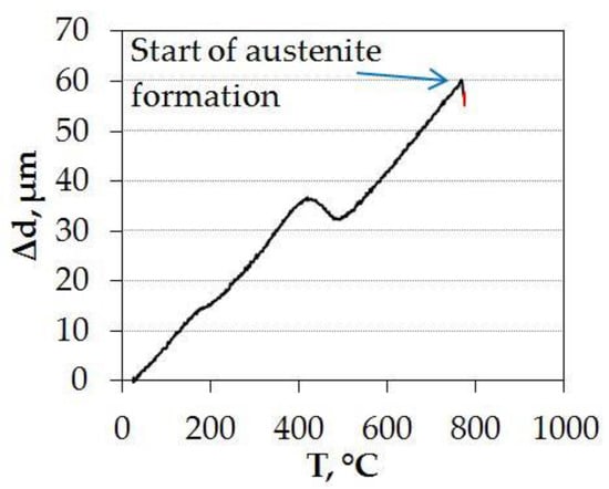 Dilatometric curve obtained during heating and soaking a specimen to the deformation temperature on a Bähr MDS 830 machine.