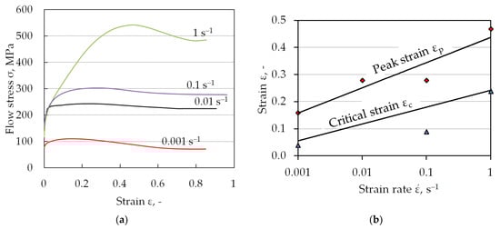 Flow curves (a) and influence of strain rate on value of peak strain and critical strain below which was the beginning of dynamic recrystalization (DRX) (b).