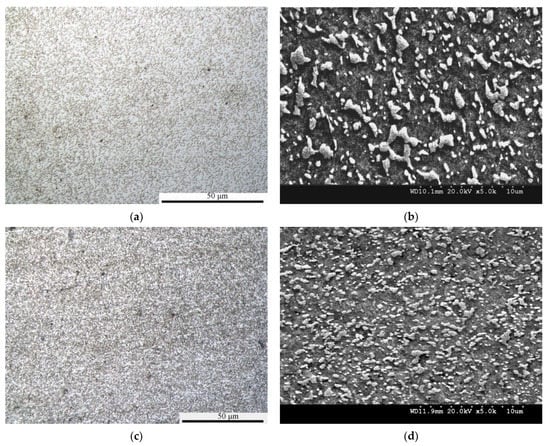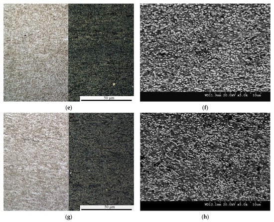 Microstructure of Fe-0,85Mo-0.65Si-1.4C steel after testing with strain rate (a,b) 0.001 s−1, (c,d) 0.01 s−1, (e,f) 0.1 s−1, and (g,h) 1 s−1. Light microscopy (LM) for (a,c,e,g) and SEM for (b,d,f,h).