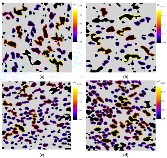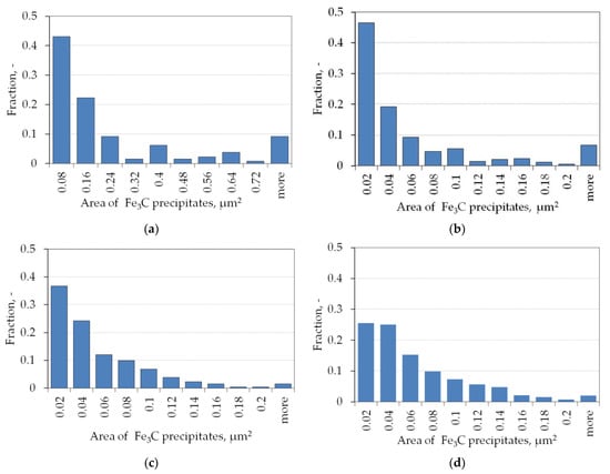 Distribution of the surface area of a flat section of Fe3C precipitates after deformation at 775 °C with a strain rate: (a) 0.001, (b) 0.01, (c) 0.1, (d) 1 s−1.