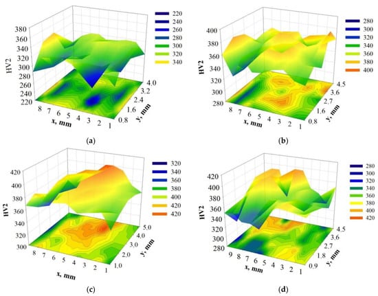 Hardness HV2 maps of specimens after testing at strain rate: (a) 0.001, (b) 0.01, (c) 0.1, (d) 1 s−1.