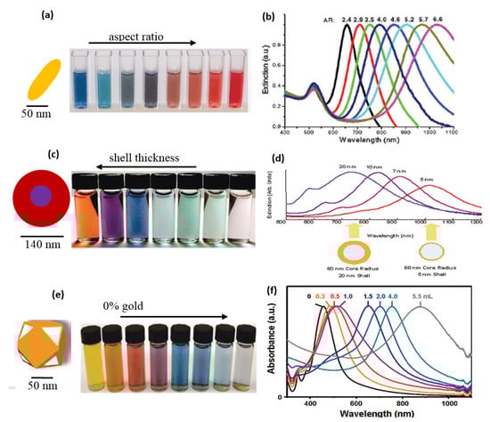 - Liu, Y.; Yang, L.; Shen, Y. Hydrothermal Synthesis of Gold Nanoplates and their Structure-Dependent LSPR Properties. J. Mater. Res. 2018, 33, 2671–2679. [Google Scholar] [CrossRef]