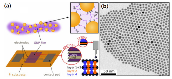 - Ketelsen, B.; Tjarks, P.P.; Schlicke, H.; Liao, Y.-C.; Vossmeyer, T. Fully Printed Flexible Chemiresistors with Tunable Selectivity Based on Gold NPs. Chemosensors 2020, 8, 116. [Google Scholar] [CrossRef]