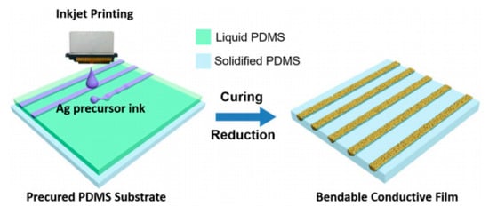 - Sun, J.; Jiang, J.; Bao, B.; Wang, S.; He, M.; Zhang, X.; Song, Y. Fabrication of Bendable Circuits on a Polydimethylsiloxane (PDMS) Surface by Inkjet Printing Semi-Wrapped Structures. Materials 2016, 9, 253. [Google Scholar] [CrossRef]
