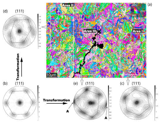 Figure 1a shows the inverse pole figure (IPF) map of the quasi-homogeneous microstructure on the plane–strain crack path. In the IPF maps, the lath-morphology of the microstructure remained after the recalculation of EBSD maps with the maximal misorientation angle of 15°. Pole figures of an ODF were rotated to show the symmetry around the (111) poles. Area I displays high symmetry in Figure 1c, which compares to the ideal 6-fold symmetry, as represented in Figure 1b. Area II displays strongly deformed 6-fold symmetry (Figure 1d). Notably, strong (110) orientations, indicated by A in Figure 1e, appear on the great circle of the (111) pole figure in the plane-strain cracked Area III and lead to a strong offset of the 6-fold symmetry.