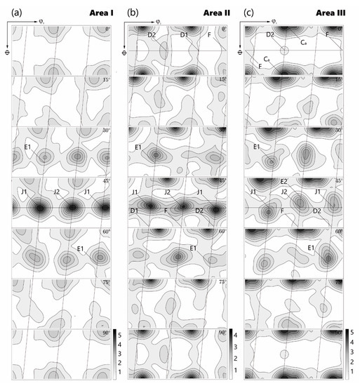 Euler sections to visualize ODF in (a) Area I, (b) Area II, and (c) Area III with monoclinic symmetry.