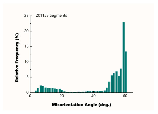 Experimental grain boundary misorientation distribution of the hierarchical microstructure investigated. The grains with misorientation ≤2° were treated as one unit.