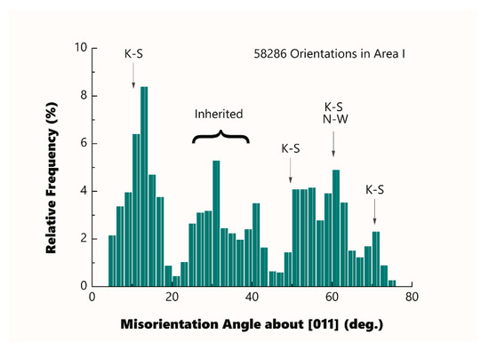Figure 4 shows the distribution of misorientation angles around the [011] axis between neighboring variants in Area I. Similar misorientation distributions were also obtained for Areas II and III. In the figure, several misorientation peaks, at about 13°, 31°, 41°, 51–55°, 61°, and 71°, are seen. This observation of multiple misorientation peaks suggests that the dominating orientation relationship is not exactly that due to Kurdjumov–Sachs (K–S) [15] or Nishiyama–Wassermann (N–W) [16]. The K–S and N–W relationships are the most commonly observed during displacive transformations, albeit small deviations do exist. As shown in Figure 4, some observed peak misorientations are close to, but not the same as, the values 10.5°, 49.5°, 60°, and 70.5°, expected from the K–S orientation relationship. The low misorientation angle population approximately in the range of 20–40° could represent the misorientation angles inherited from the prior austenite grains [12].
