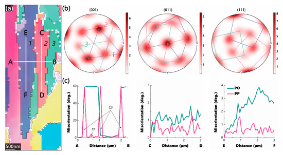 To investigate the origin of high symmetry, IPF coloring of selected α-blocks (with maximal misorientation angle ≤5°) is shown in Figure 5a. The results of the correspondent ODF analysis on the scanned area are shown in Figure 5b to represent the 6-fold symmetry about the (001), (011), and (111) poles. The point orientations from the individual blocks are connected with solid lines in roughly identical colors of blocks. It is shown that each block in Figure 5a (denoted by the number 1, 2 or 3) contributes to almost one-third of the 6-fold-symmetric pattern in the pole figures of an ODF. The repetition or rotation of twinning may explain the observation (see below). Figure 5c shows the fluctuations in misorientations along with the line segments A–B, C–D, and E–F drawn in Figure 5a. The line segment A-B goes across three block boundaries, and these boundaries were determined to be Σ3, i.e., twin boundaries. A boundary relatively close to the Σ1 orientation was also found within the same block. The line segments C–D and E–F lay inside the individual blocks, where only small misorientations ≤5° were found.