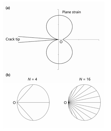 (a) Plastic zone shapes in Mode I according to Von Mises yield criteria. The boundary of the plastic zone is plotted non-dimensionally according to Equation (1). O is the location where the crack tip is about to propagate. (b) Schematic explanation of the geometric number N. The individual chord length of a 2D-intersection of a 3D-α ellipsoid is denoted by L and the average chord length by , respectively. N − 1 chords cut the intersection equally. The schemata have a superposition nature and combine the possible pathways of the crack. High symmetry generally diminishes N and enlarges . According to Equation (7), .