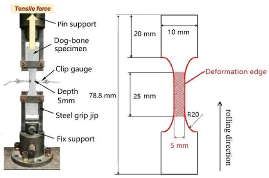 Test setup and the details of tensile specimens of the dog bone geometry.