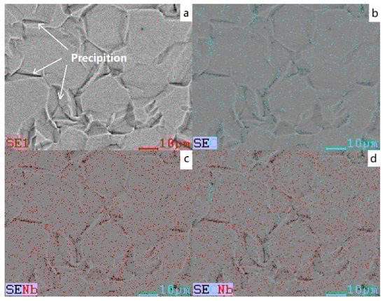 Scanning electron microscopy (SEM) image (a) and EDS element mapping (b,c,d) of Fe-28Mn–10Al–C–0.5Nb: (b)C, (c) Nb, and (d) C and Nb.