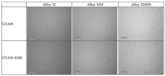 In the middle region, all the welds possessed a mixture of columnar and cellular dendrites, as shown in Figure 6. Under the influence of EMS, the columnar dendrites were affected by the electromagnetic field, leading to the formation of fragmented dendrites. Alloy 52MSS welds had many precipitates in the inter-dendritic areas.