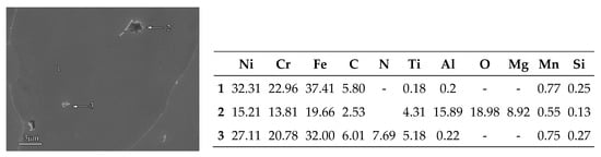 The compositional analysis shows that the precipitates in the Alloy 52 weld are Ti(N,C)s. In some cases, Ti(N,C)s are mixed with Al-Mg oxides, as shown in Figure 9. In the root region, the precipitates comprising Ti(N,C)s and Al-Mg oxides were much bigger and darker, while those containing TiNs/TiCs smaller.