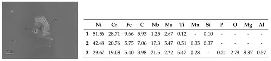 In Alloy 52M weld, the precipitates are mainly composed of Nb/(Nb,Ti)Cs, some of which mixed with Al-Mg oxides. Beside the large Nb/(Nb,Ti)Cs, there were many tiny precipitates with sizes below 400 nm. According to the EDS analysis, Figure 11, they are Nb/(Nb,Si)Cs as well. In the root region, the coarse and slender precipitates are mainly comprised of Nb/(Nb,Ti)Cs. Like those in the cap region, some precipitates are Nb/(Nb,Ti)Cs mixed with Al-Mg oxides. Some cubic (Nb,Ti)Ns were also observed in the root region.