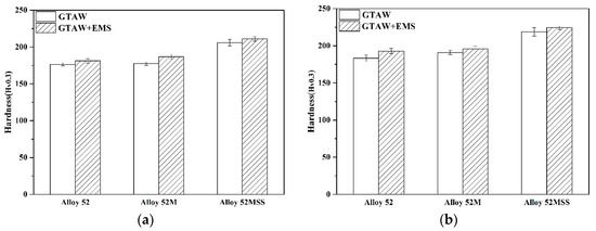 - The hardness measurements of all welds were improved by EMS. Of all welds, the average hardness in the middle region was slightly higher than that for the cap, and Alloy 52MSS welds had the largest hardness measurement.