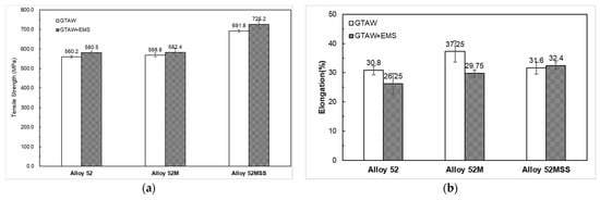 Figure 16b shows the averaged elongation measurements for all specimens. Alloy 52M weld had the highest elongation. Except for Alloy 52MSS, the others decreased in elongation with EMS applied. This could be attributed to the fragmented dendritic structures. The microstructural characterization demonstrates that the dendrites were originally continuous; however, they were fragmented by EMS, thereby resulting in the decrease of the tensile elongation of weld specimen. EMS had no influence on the elongation of Alloy 52MSS welds, because it makes little or no difference in change of modification to their microstructure.