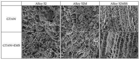 - The fractographic observations showed that ductile dimples were the dominant fracture feature of all tested welds, and that the dimples of Alloy 52MSS were shallower and sparser. For all the welds prepared with an application of EMS, shallower dimples were the representative fracture feature of all specimens, which could be related to the discontinuous dendritic structure.